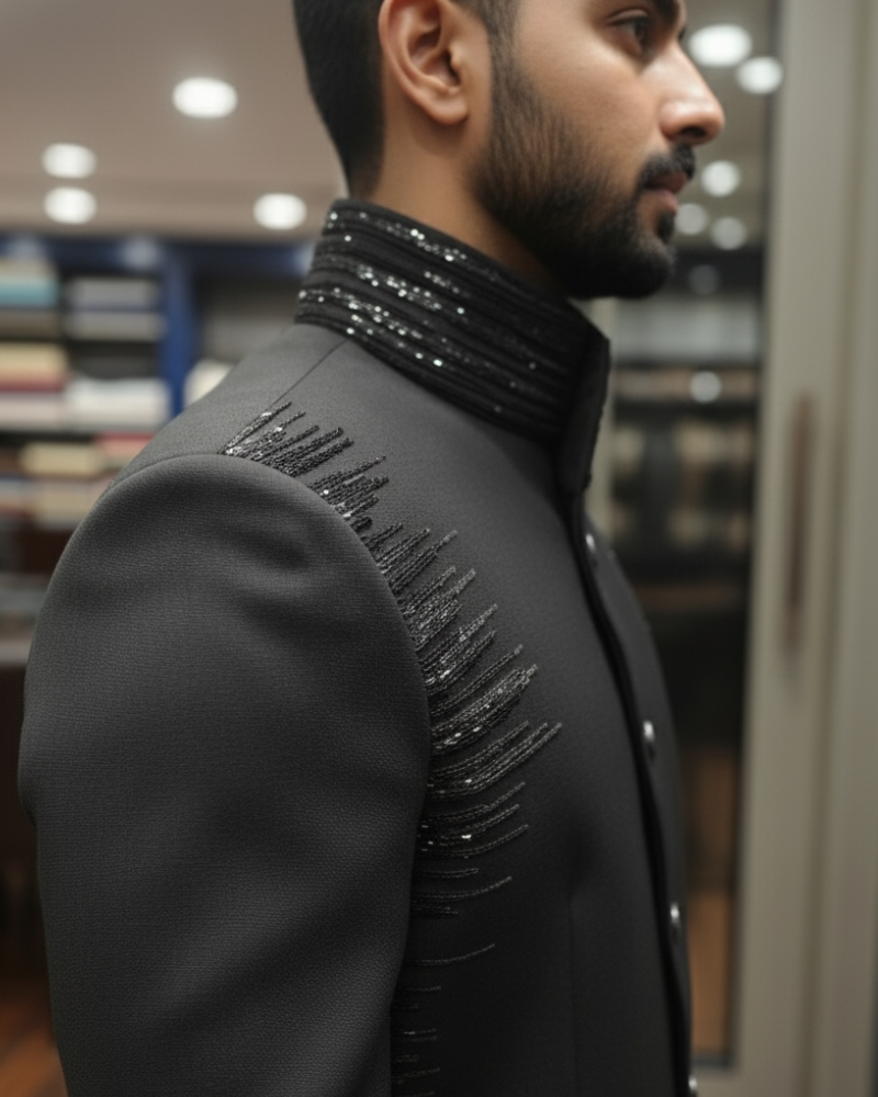 A masterpiece of understated opulence, this black bandhgala features meticulous tonal beadwork along the shoulders and collar, adding a refined shimmer that catches the light with subtle elegance. The structured silhouette and contemporary detailing redefine classic menswear, making it perfect for evening receptions or grand celebrations.