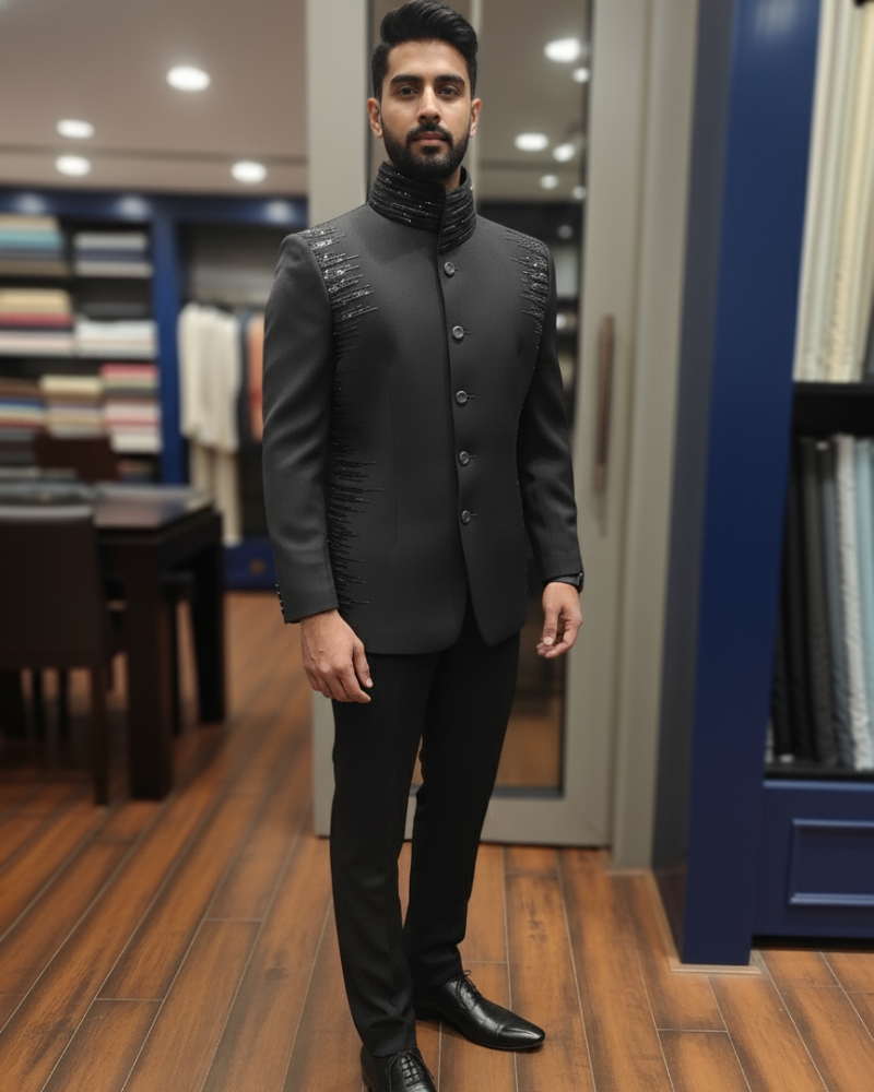 - Fabric: Premium Suiting Fabric with Hand Beaded Detailing