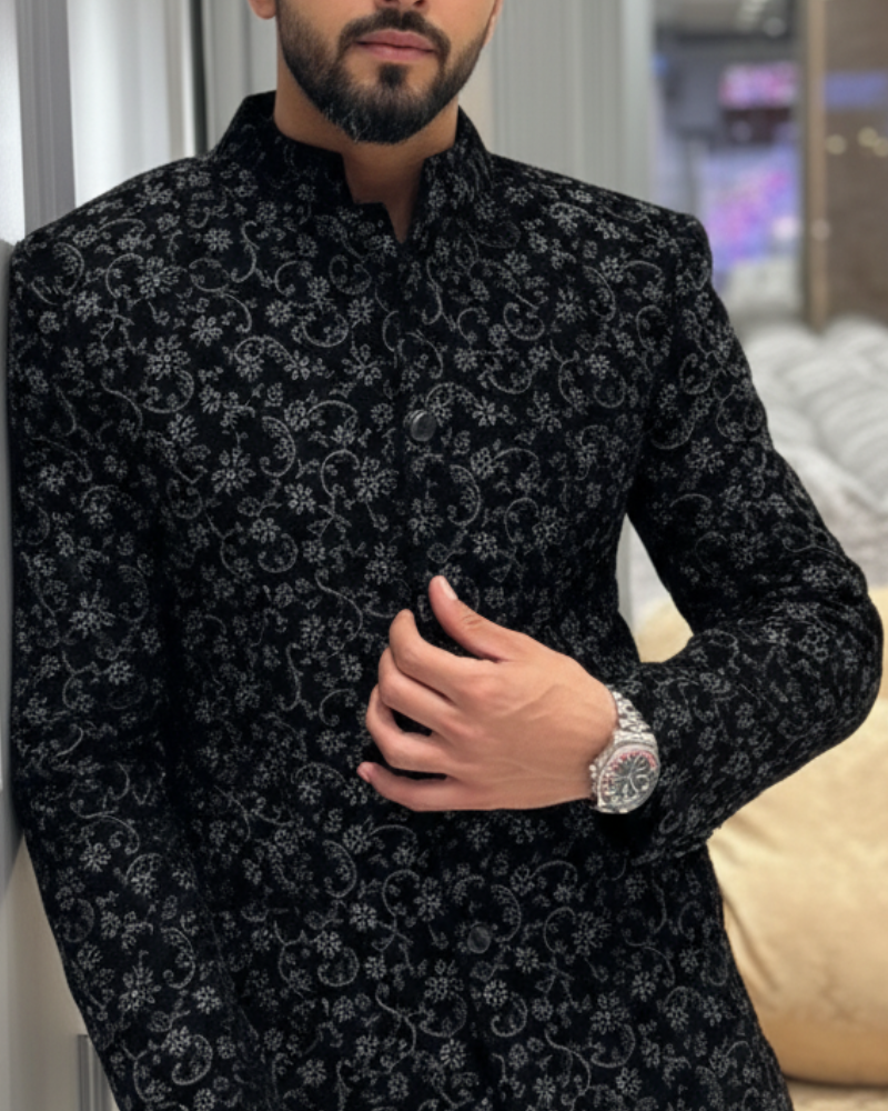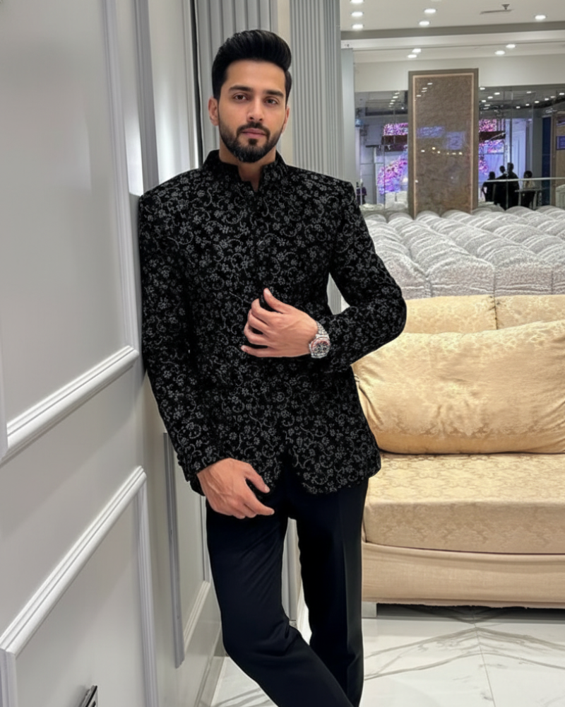 This LAPELS & CUFFS Bandhgala suit is crafted for the man who commands attention with quiet sophistication. The rich black velvet base is adorned with intricate silver thread embroidery, creating a luxurious texture that elevates the classic Bandhgala silhouette. Its structured shoulders and tailored fit offer a sharp, modern look while maintaining royal Indian elegance. Perfect for evening celebrations, cocktail nights, receptions, or high-profile events, this ensemble blends tradition and contemporary style effortlessly.
