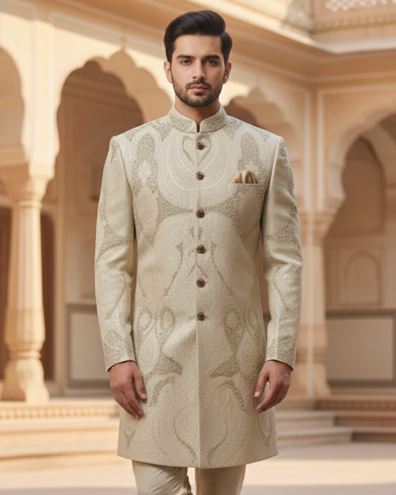 - Fabric: Premium Brocade Silk (Sherwani) & Soft Silk Blend (Churidar)