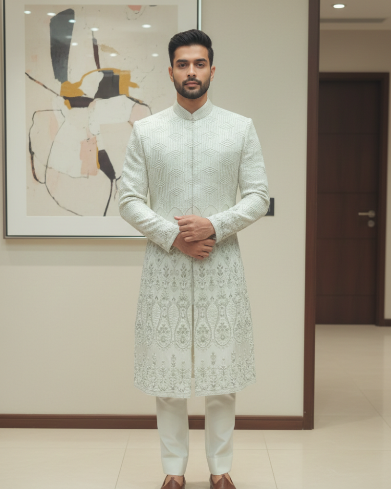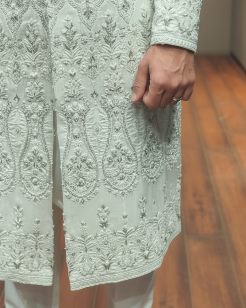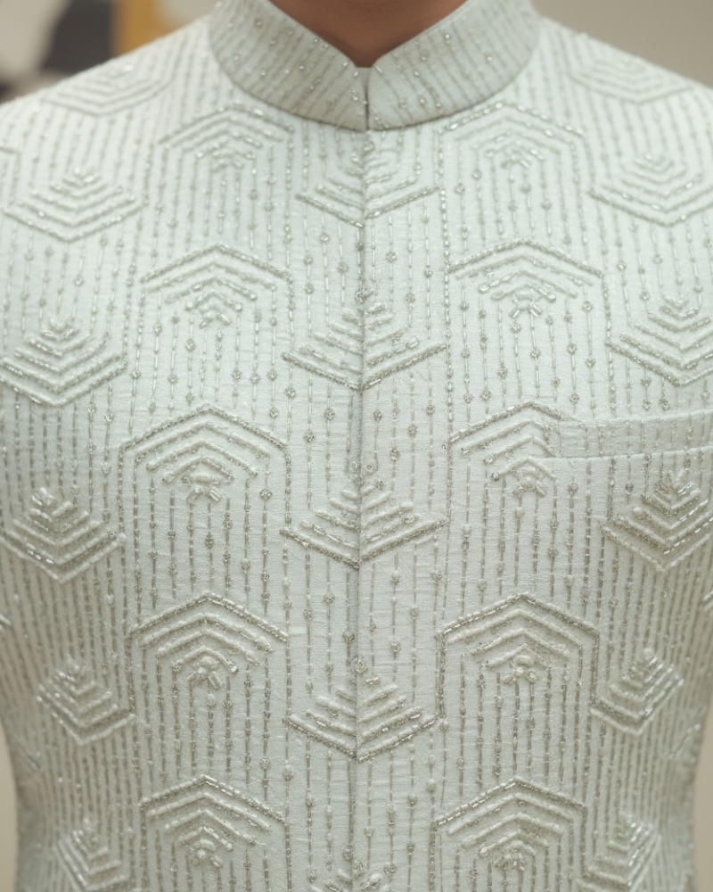 A refined mint ivory sherwani crafted with full hand embroidery, featuring elegant geometric patterns and intricate detailing along the hem. The subtle texture and tonal embroidery create depth while maintaining a clean, contemporary silhouette.