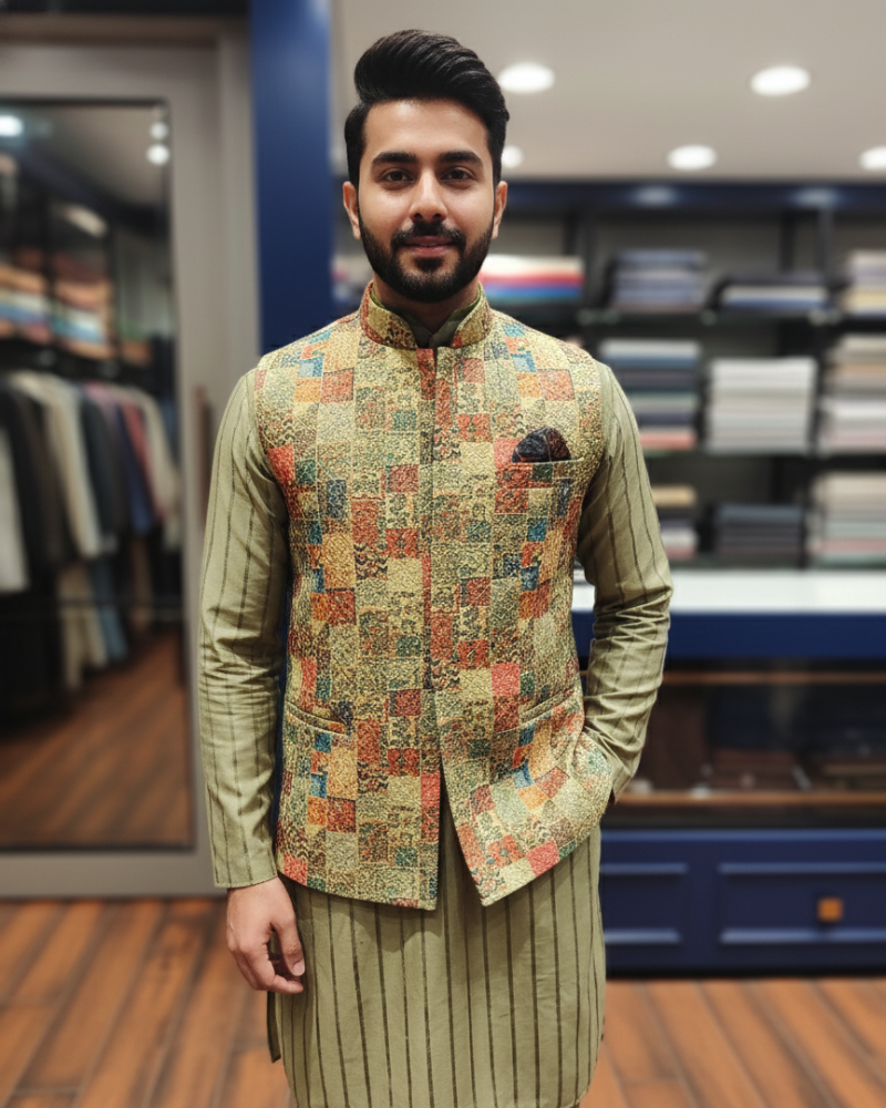 This LAPELS & CUFFS Indo-fusion ensemble blends earthy sophistication with timeless style. The olive-toned kurta and churidar are complemented by a beautifully embroidered Nehru jacket featuring intricate threadwork in subtle tones of rust, teal, and gold. Perfect for festive gatherings or intimate celebrations, this set redefines understated luxury.