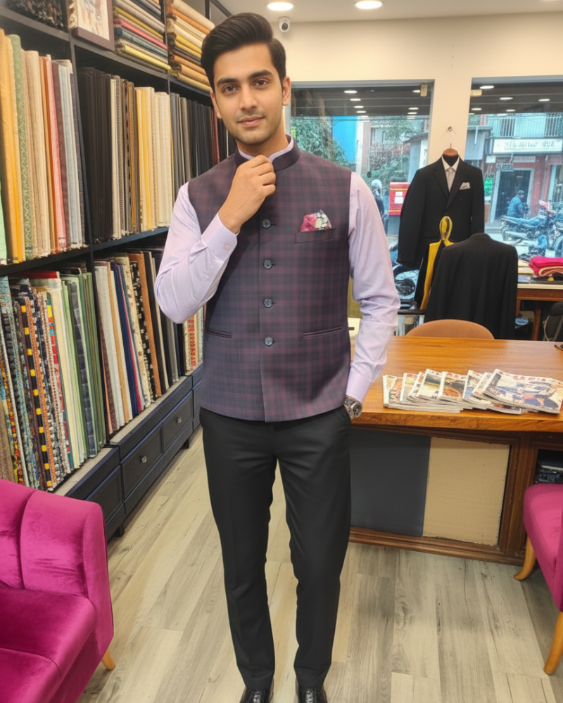 - Color: Plum Checkered Waistcoat • Lavender Shirt • Black Trousers