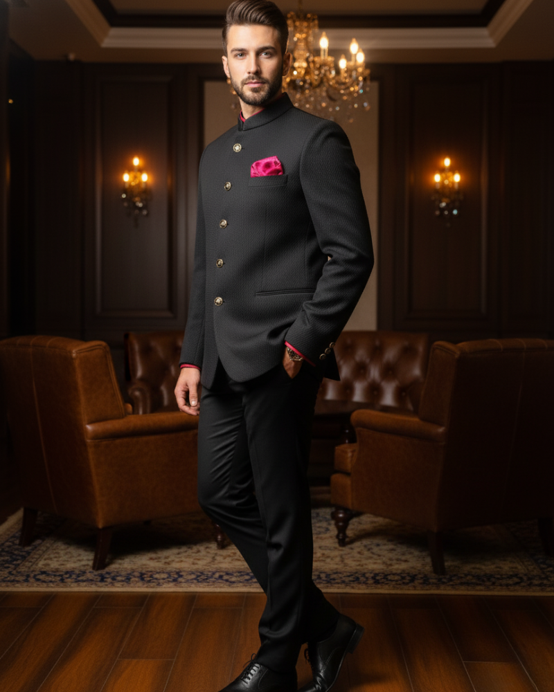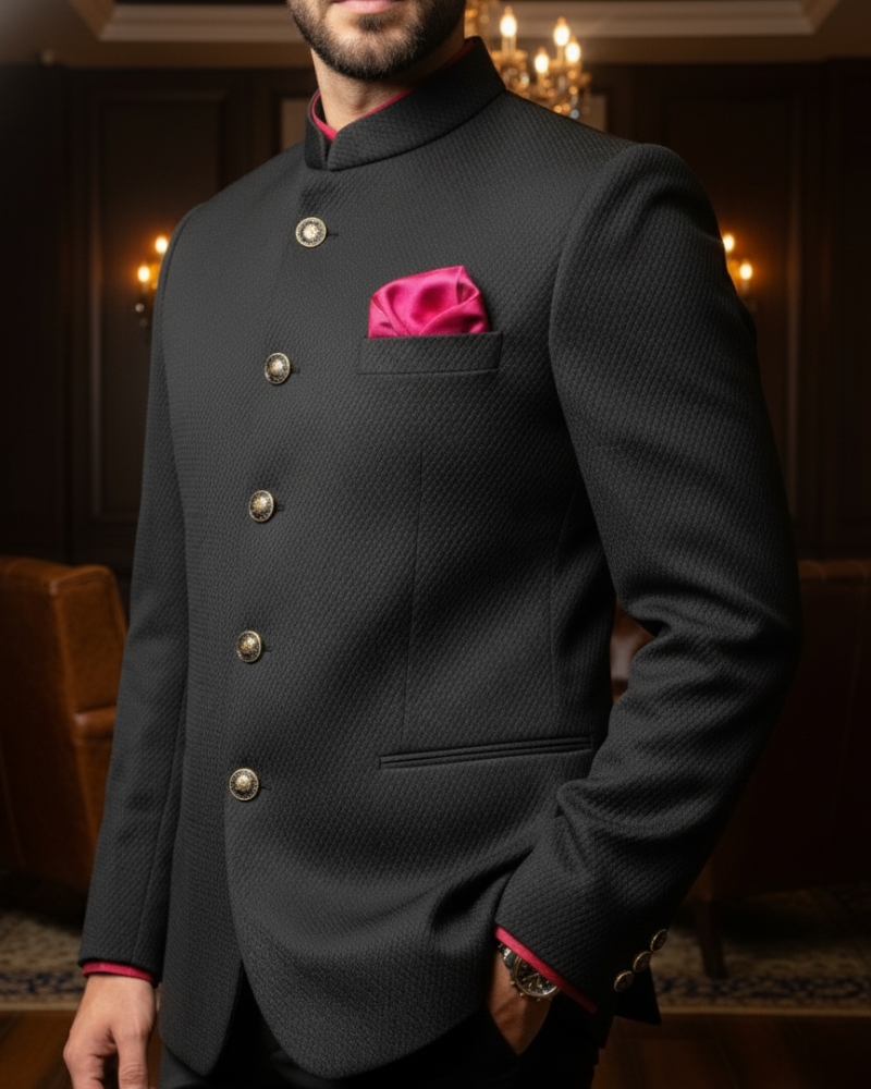 A modern interpretation of classic Indian elegance, this textured black bandhgala features a tailored silhouette with gold-toned buttons and a striking fuchsia pocket square. Designed for the contemporary gentleman, it combines traditional sophistication with understated flair — ideal for formal celebrations or evening occasions.